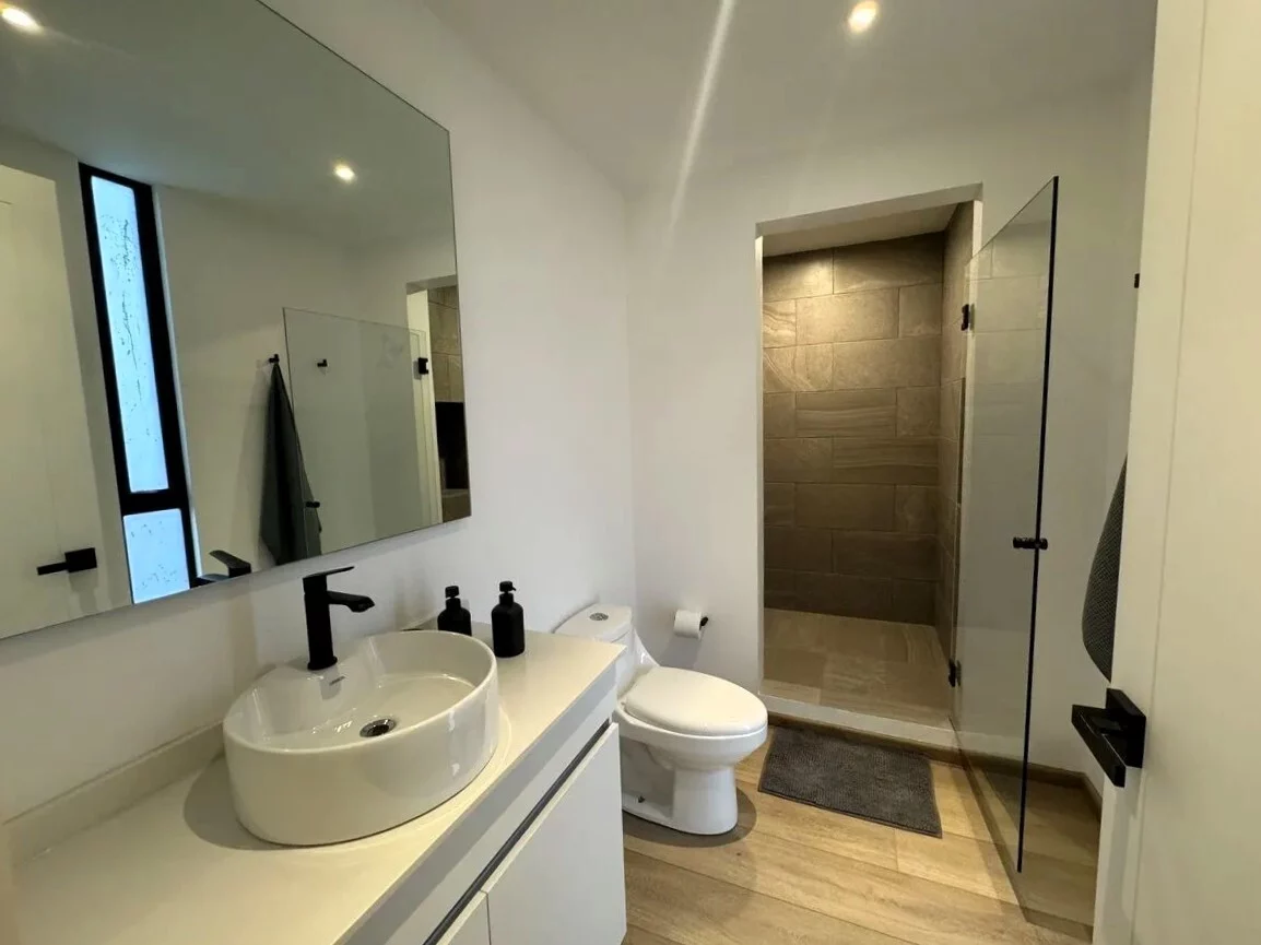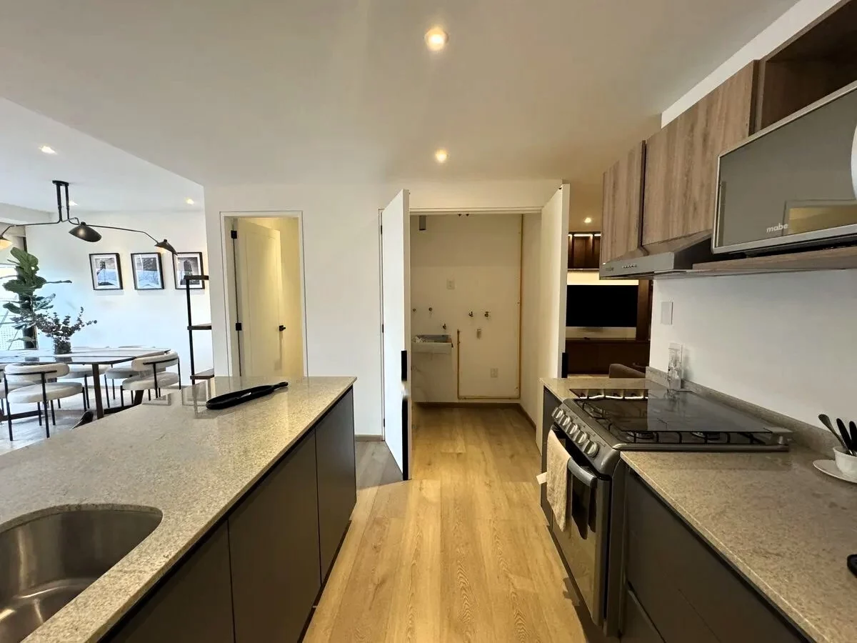 Sala, comedor con balcón y cocina abierta equipada con acabados de lujo. Medio baño para visitas. Cada departamento cuenta con 2 estacionamientos y con bodega y vigilancia 24/7.