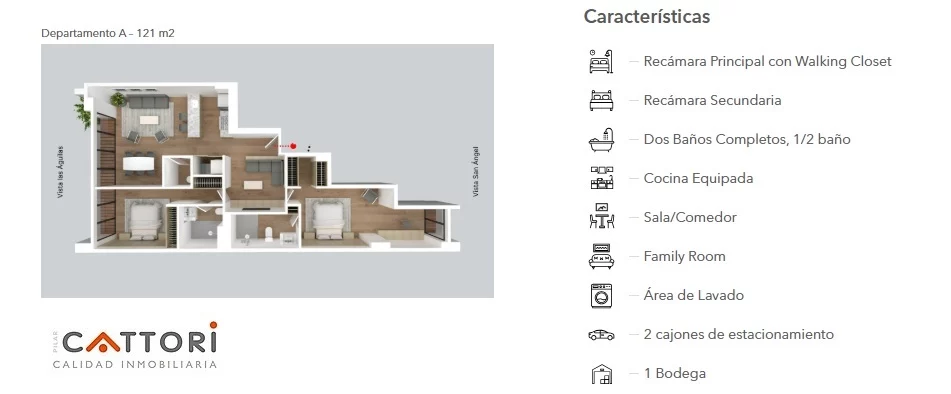 Sala, comedor con balcón y cocina abierta equipada con acabados de lujo. Medio baño para visitas. Cada departamento cuenta con 2 estacionamientos y con bodega y vigilancia 24/7.