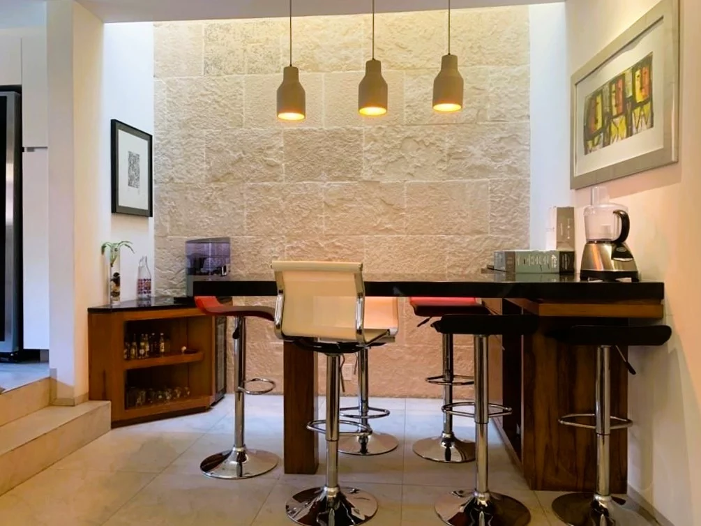 Totalmente remodelada en 2012. Consta de recibidor, sala, comedor, cocina equipada, desayunador, estudio, family muy amplio con baño completo, recámara principal con baño y las otras 2 recámaras comparten baño, cuarto de servicio y de lavado, y 2 estacionamientos cubiertos. La casa se entrega con persianas, 4 bancos del desayunador, base y cabecera de cama de recámara principal, y muebles empotrados en el family.