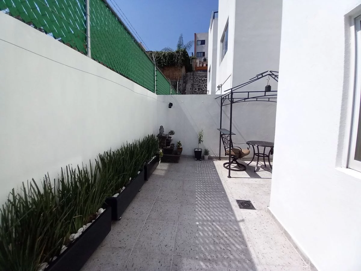 CASA EN CONDOMINIO CON JARDÍN COMÚN AL CENTRO, cerca de SIX FLAGS. Son 5 casas en el condominio, con vigilancia de 9am a 6 pm, y con excelente mantenimiento. La casa consta de 3 recámaras, la principal con baño y vestidor, las otras dos con closet y comparten baño, sala de tv o estudio, sala y comedor con salida a terraza y pequeño jardín, medio baño, cocina abierta, área de lavado, cuarto de servicio, y 2 lugares de estacionamiento techados.