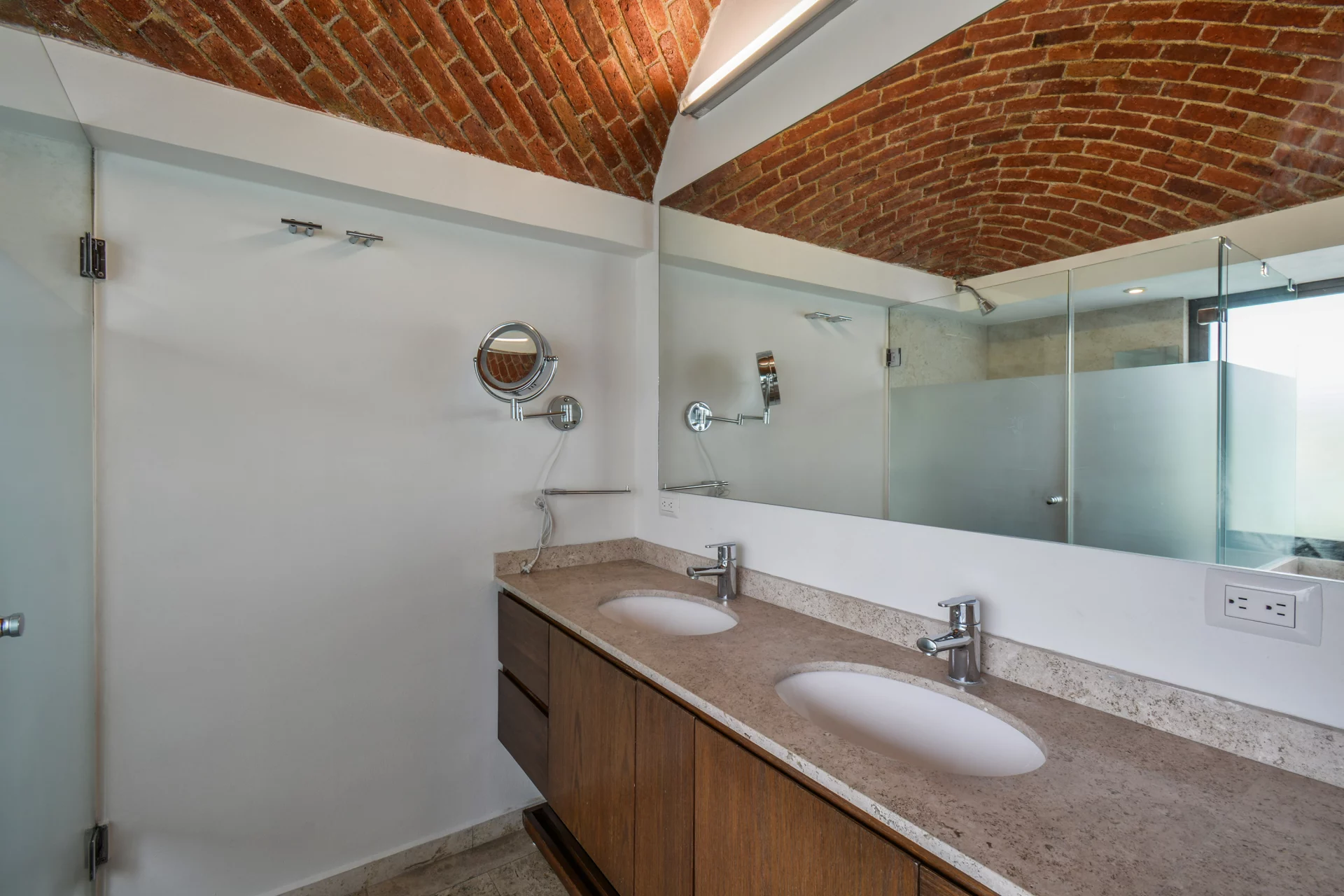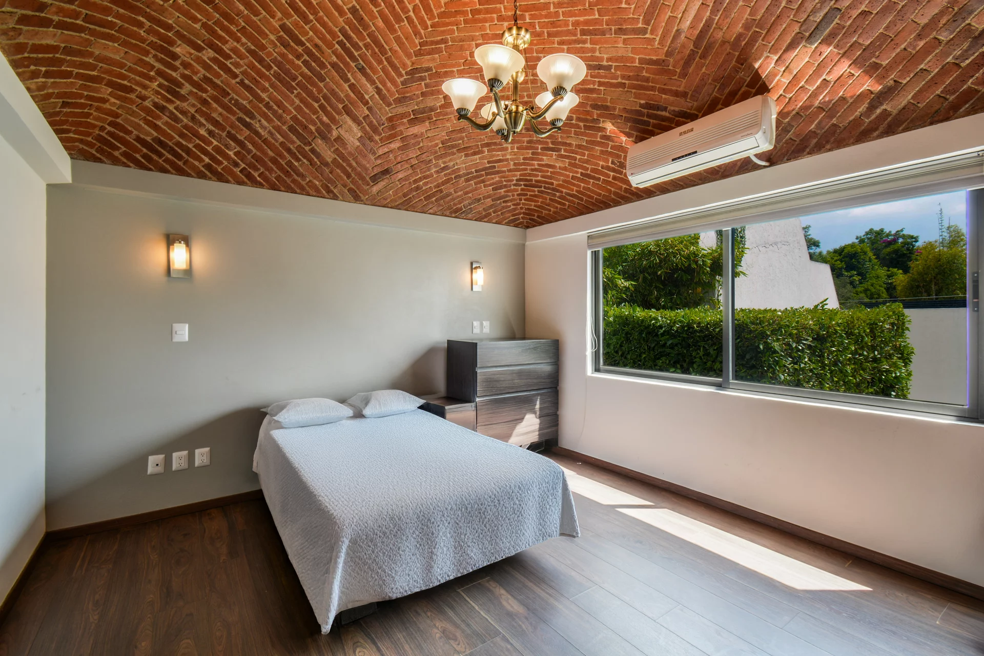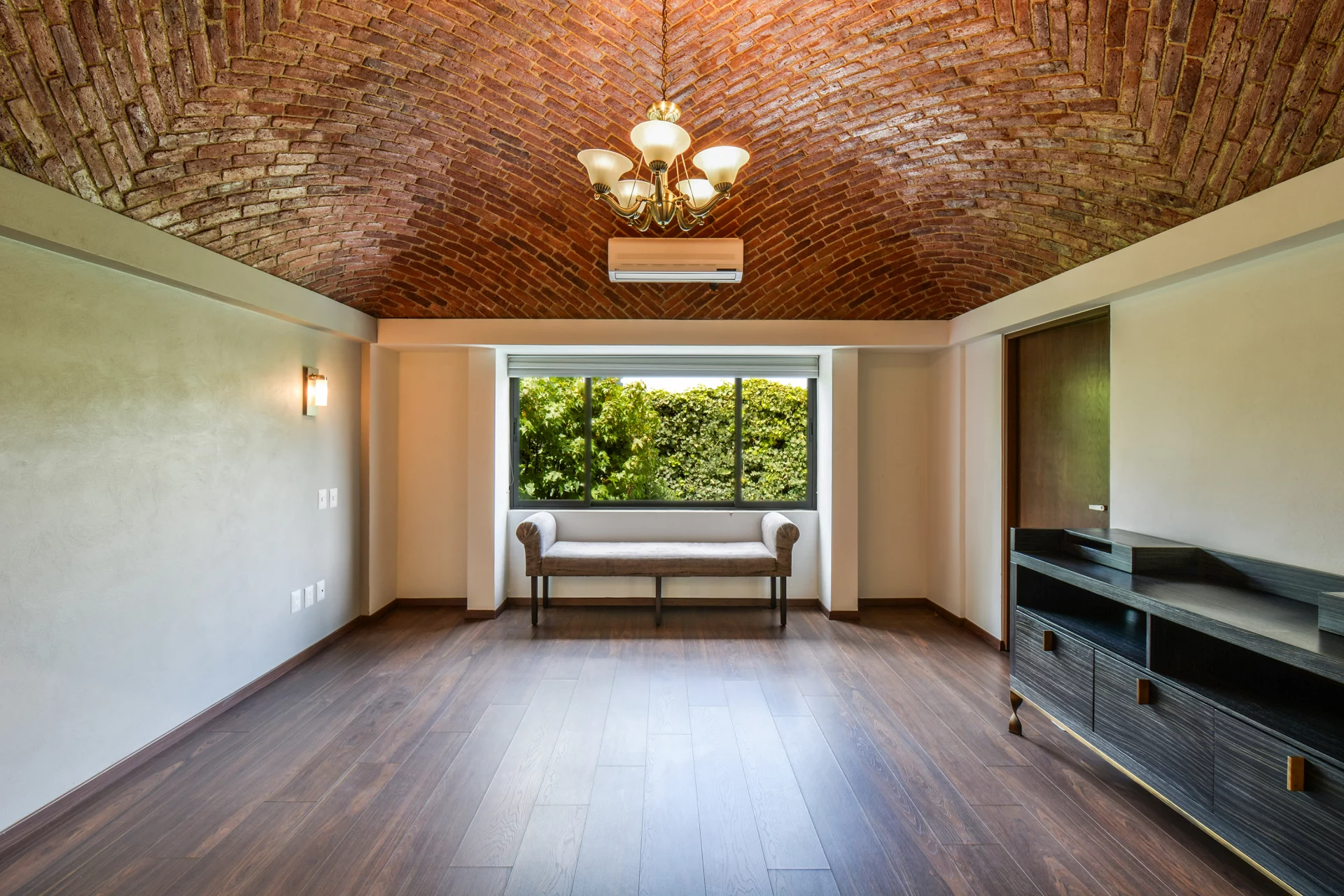 La planta alta alberga tres recámaras, cada una con baño propio, brindando privacidad y confort. Dos de ellas cuentan con vestidor y la tercera con clóset. En este nivel destacan las bóvedas catalanas, que aportan carácter arquitectónico y una sensación de mayor amplitud. Tanto en las recámaras como en la sala, la propiedad cuenta con aire acondicionado, lo que asegura un ambiente confortable durante todo el año.