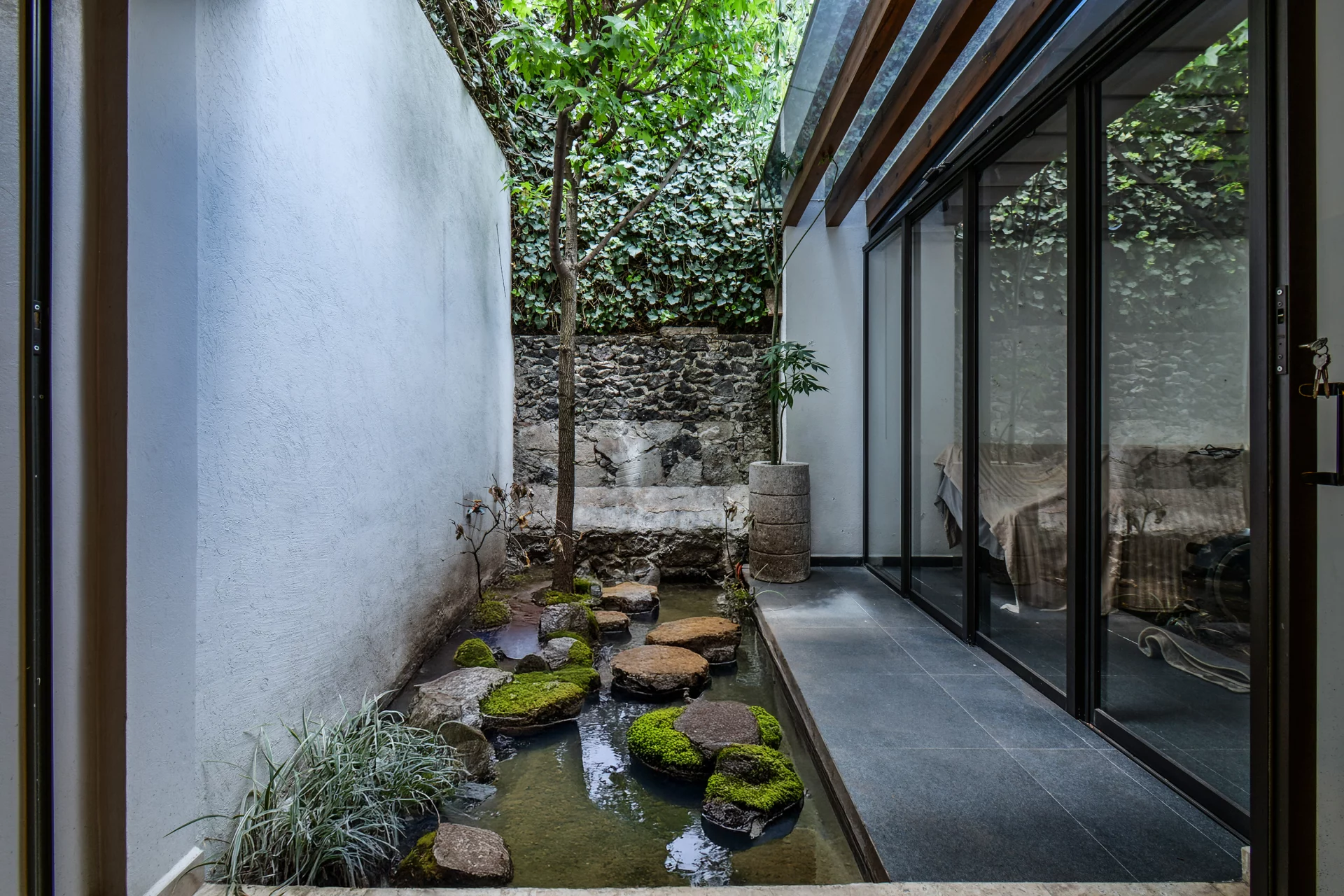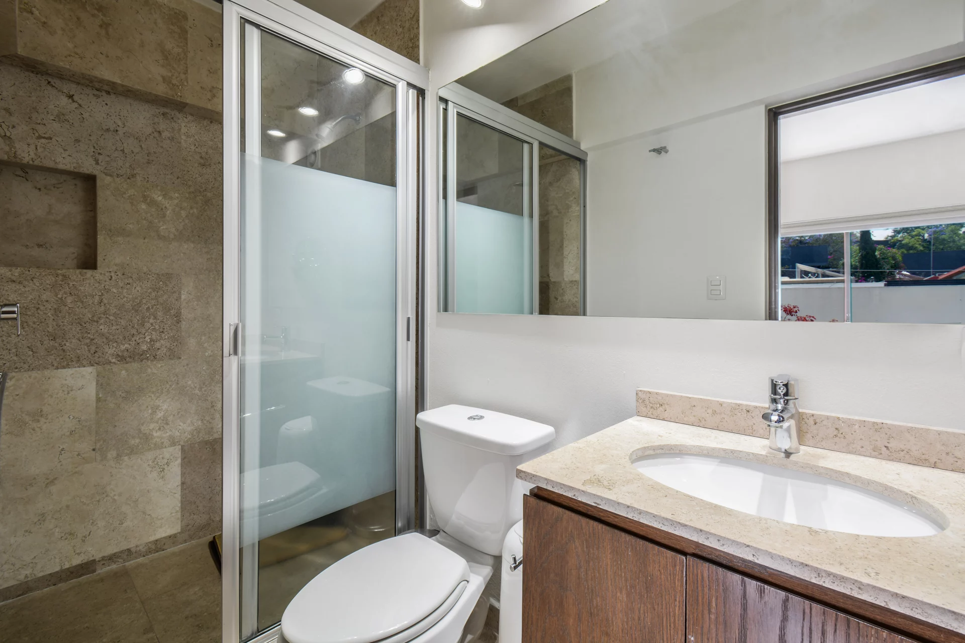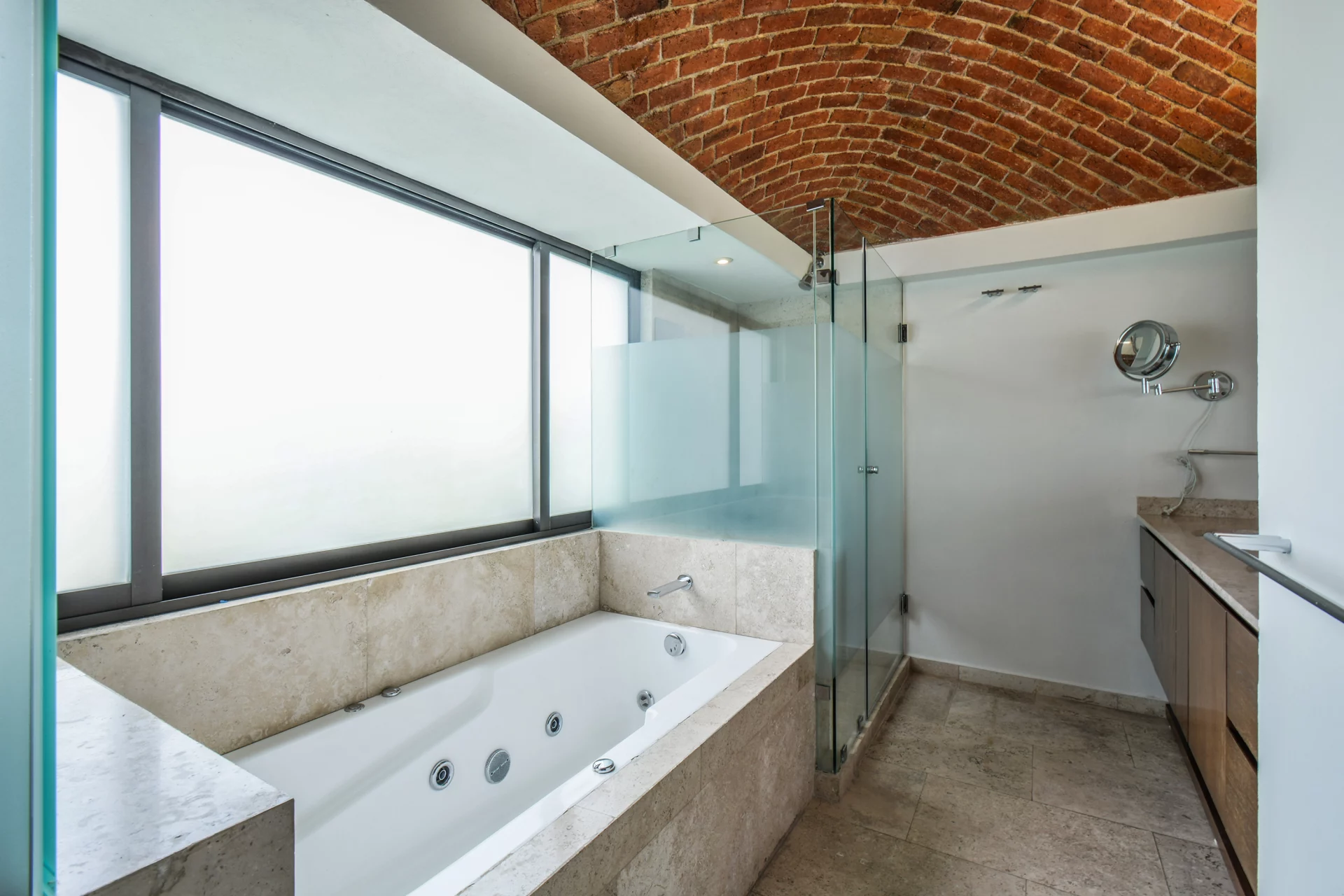 La planta alta alberga tres recámaras, cada una con baño propio, brindando privacidad y confort. Dos de ellas cuentan con vestidor y la tercera con clóset. En este nivel destacan las bóvedas catalanas, que aportan carácter arquitectónico y una sensación de mayor amplitud. Tanto en las recámaras como en la sala, la propiedad cuenta con aire acondicionado, lo que asegura un ambiente confortable durante todo el año.