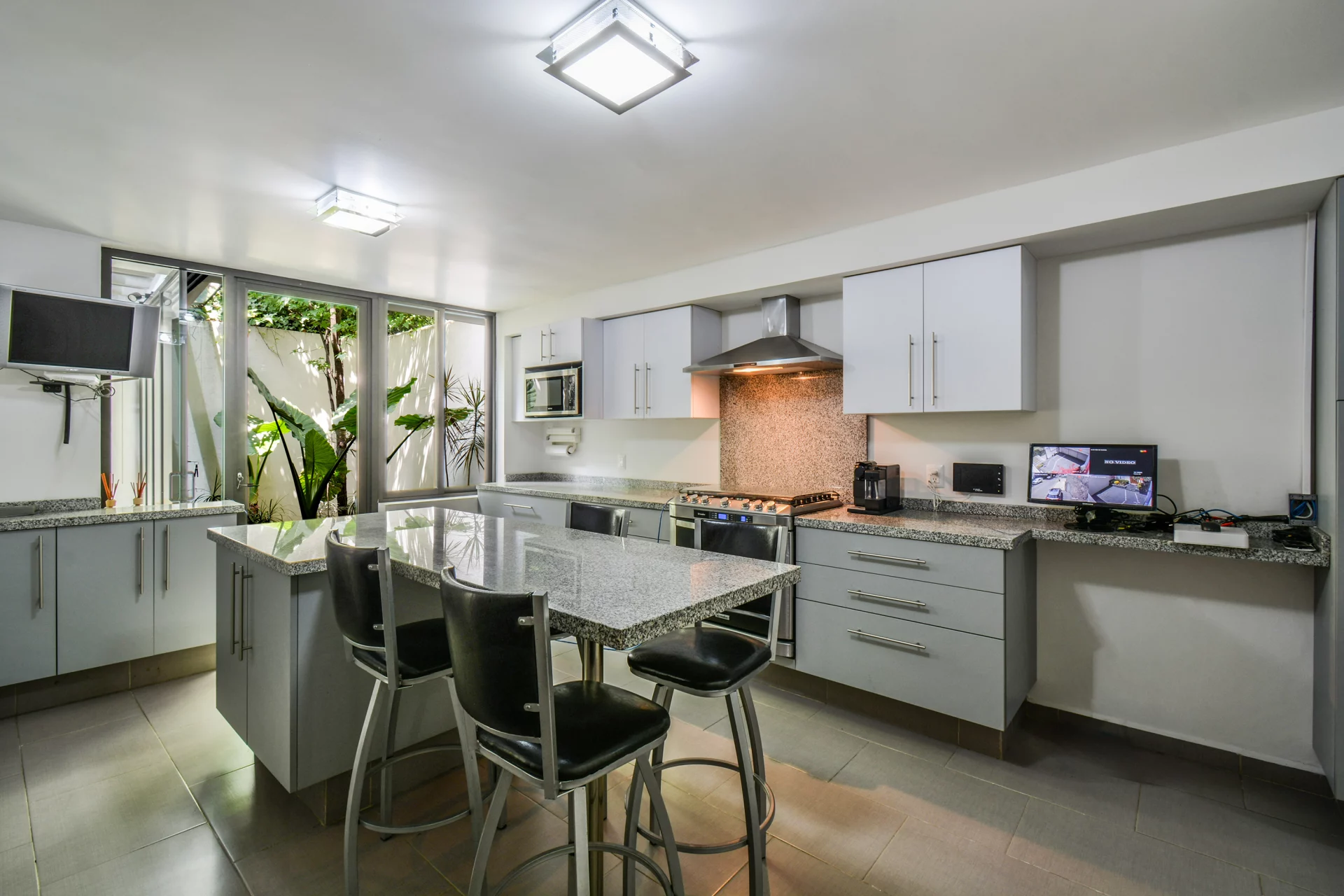 En planta baja, la casa recibe con una estancia amplia de sala y comedor, ideal para disfrutar en familia o recibir invitados. El comedor y la cocina tienen acceso directo a dos terrazas de tamaño práctico, que aportan luz natural, ventilación y una agradable conexión con áreas verdes. En este mismo nivel se encuentra un estudio, baño de visitas, un cuarto de TV y una cocina cerrada de generosas dimensiones, pensada para un uso cómodo y práctico.