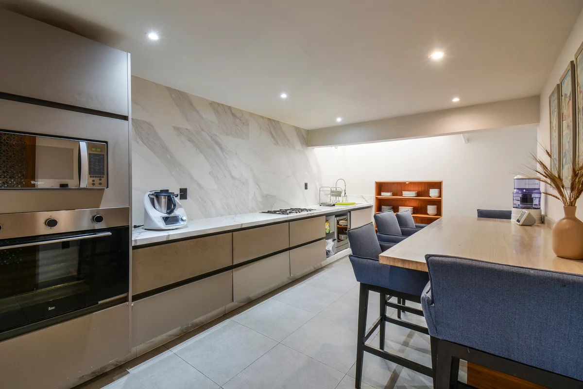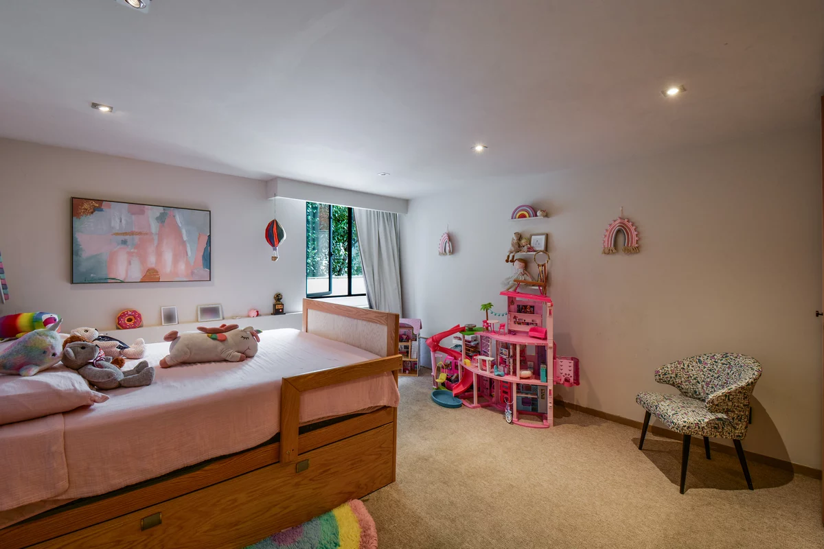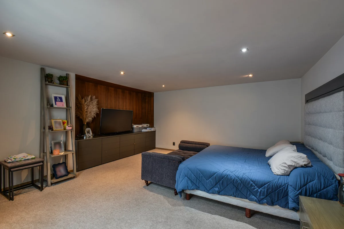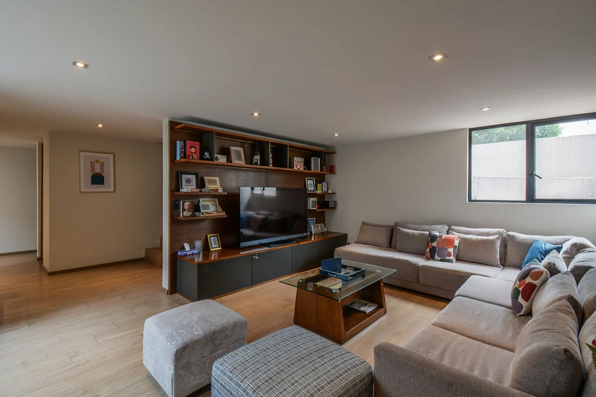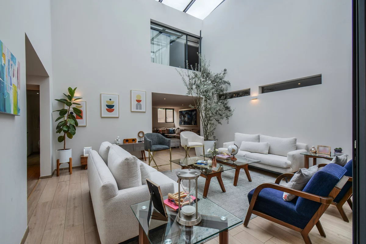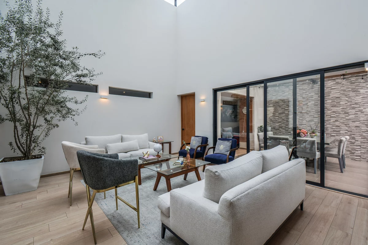 Imagina una sala a doble altura y luz natural durante el día, terraza para tus reuniones con área de bar, , cocina con barra desayunador, estudio, sala de tv, y 3 recámaras, la principal con amplio vestidor y baño, y las otras 2 con closet y comparten baño (una de ellas con terraza).