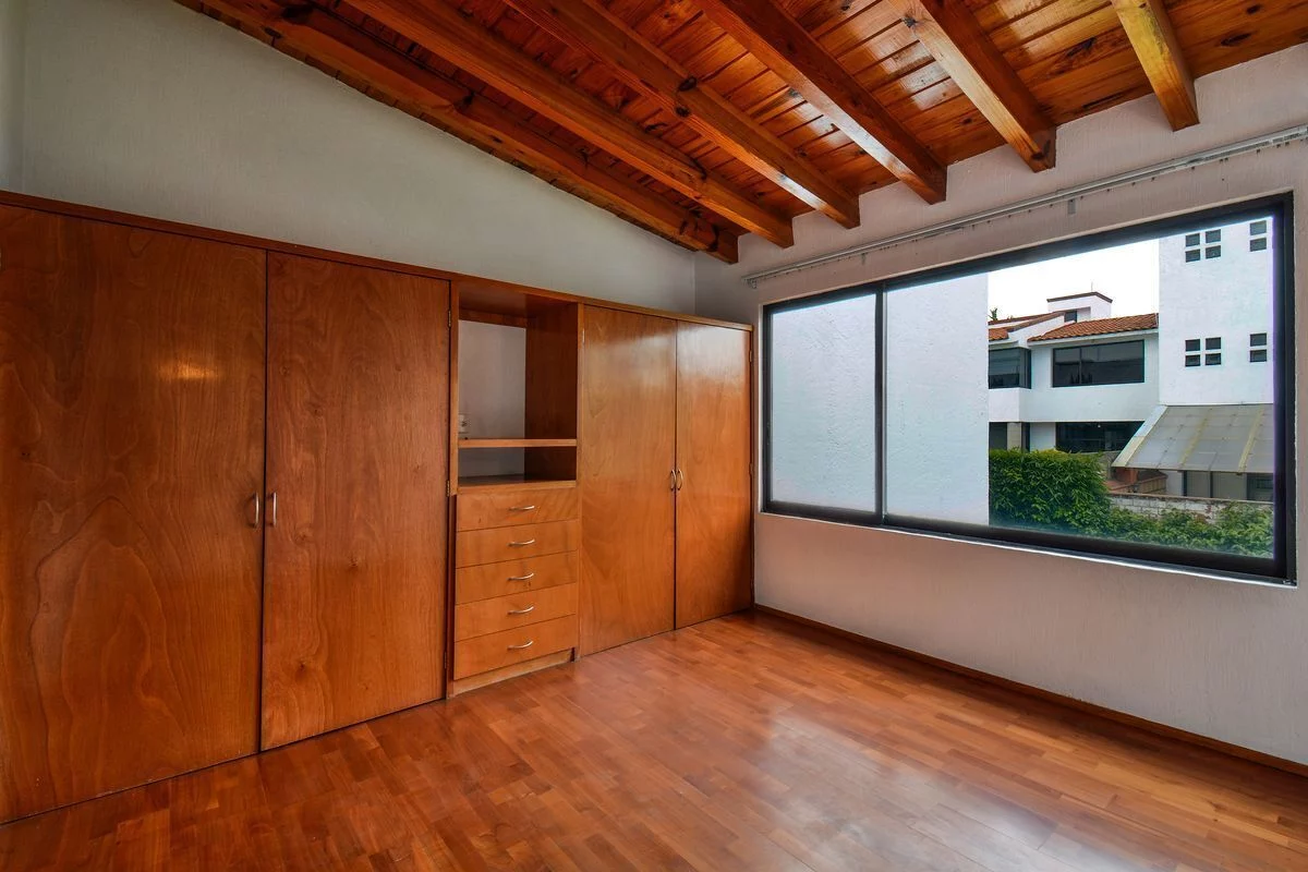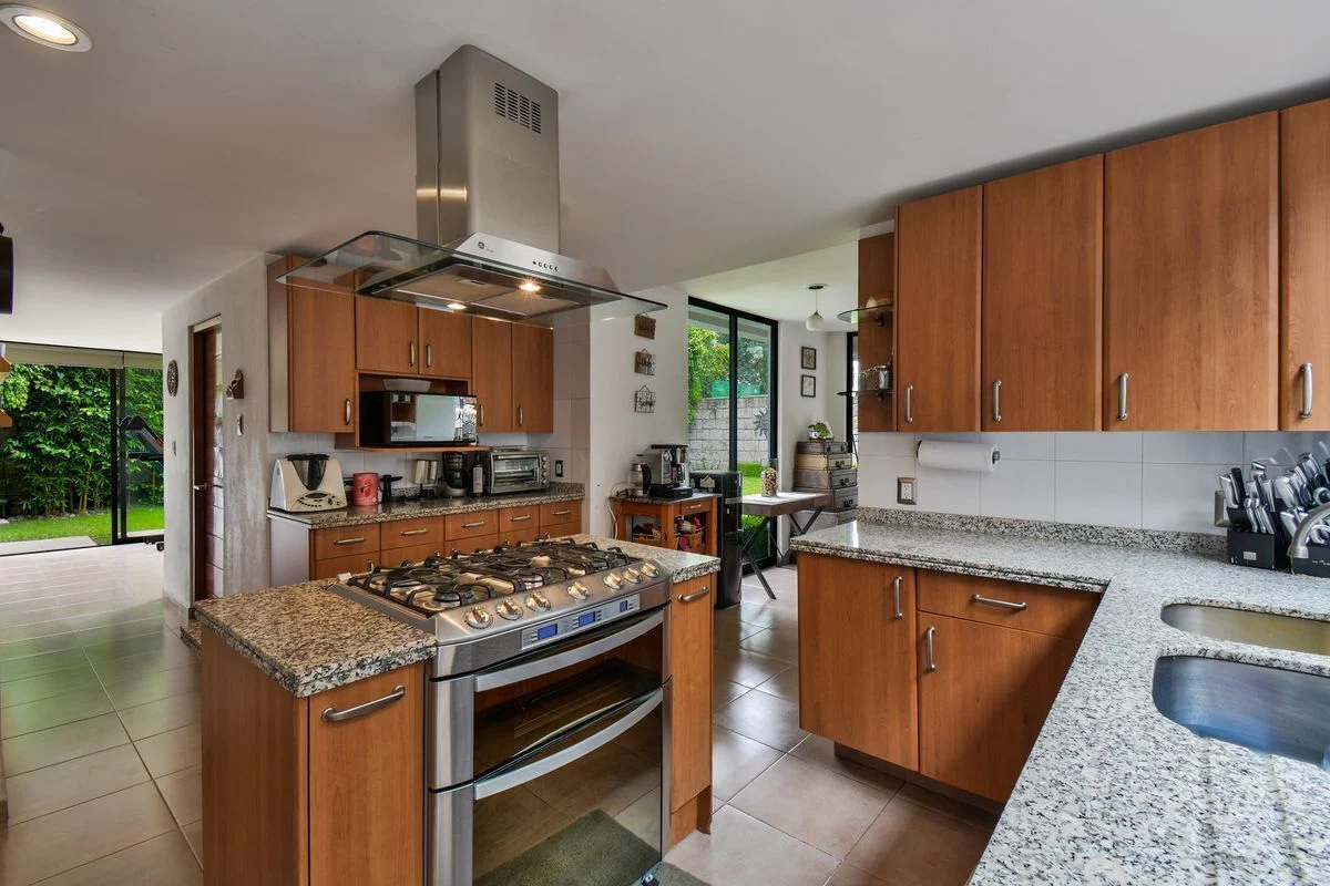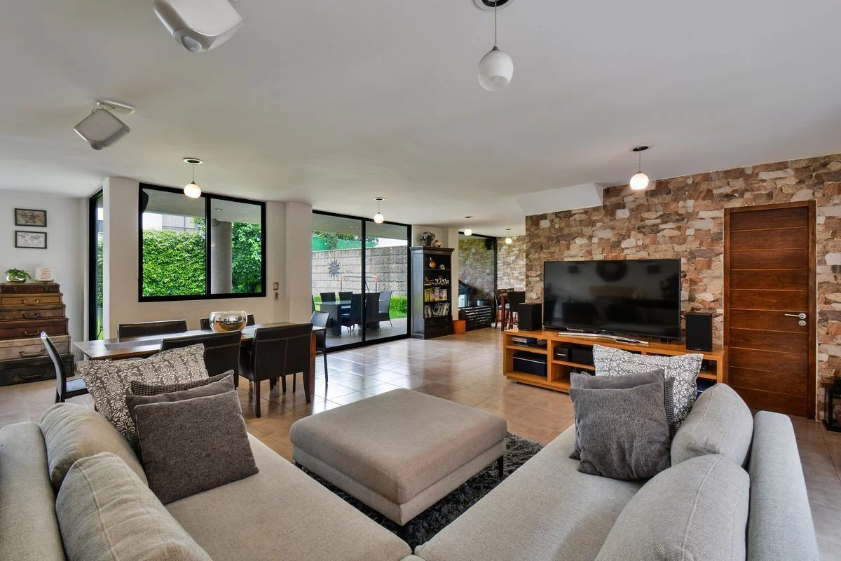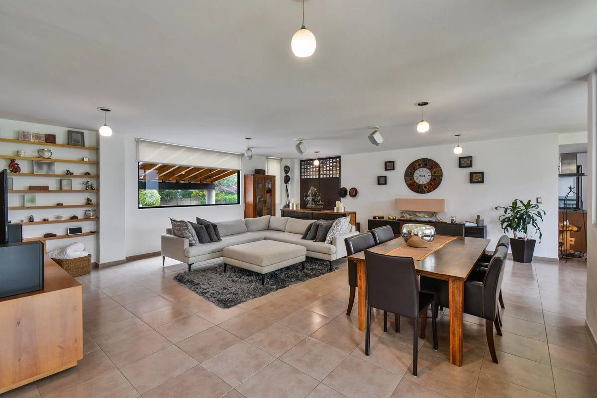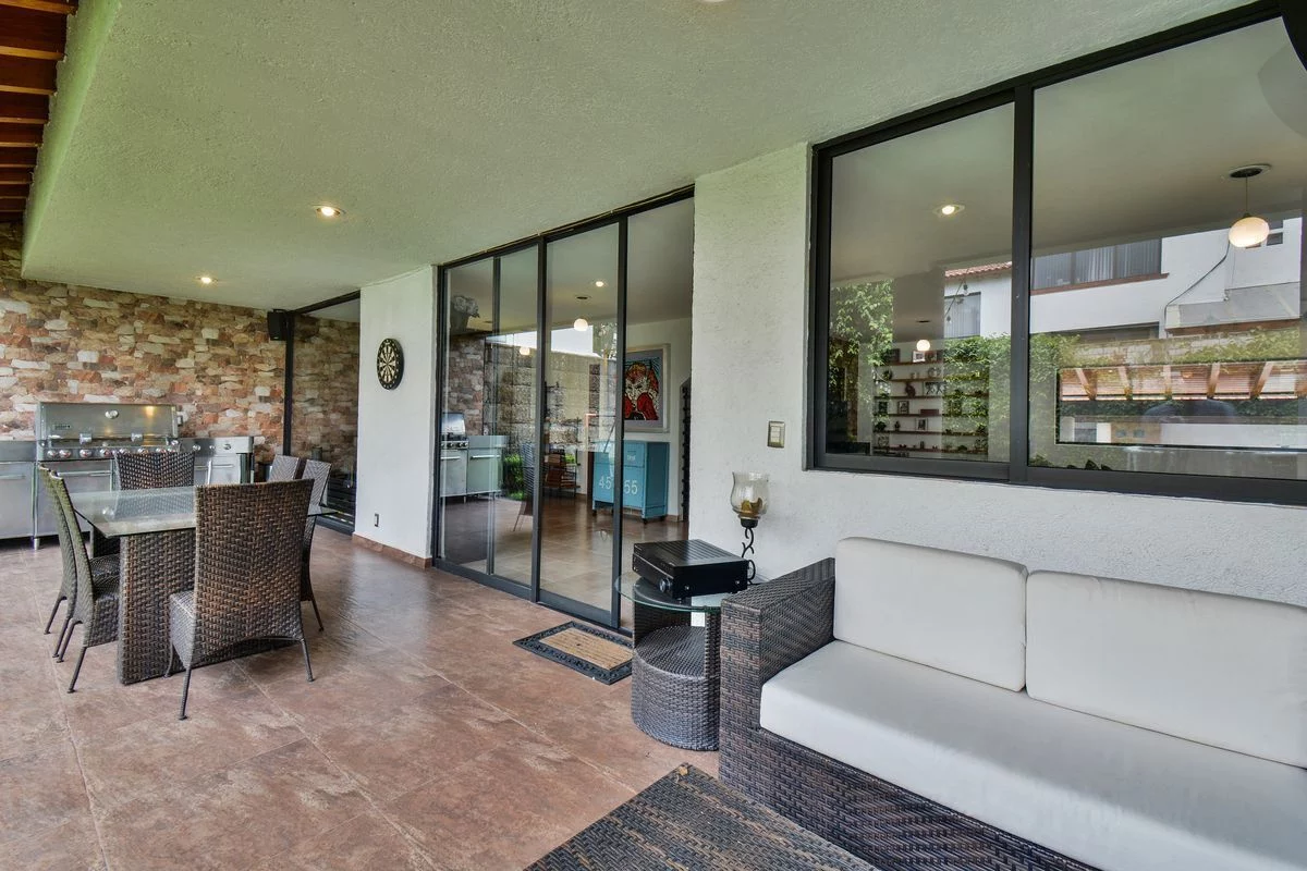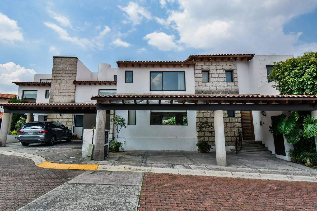 La casa te ofrece dobles alturas, techos altos, espacios muy luminosos y espaciosos. En planta baja cuenta con vestíbulo, sala con chimenea y bar con vista al jardín, comedor con salida al jardín, estudio, medio baño, cocina equipada, antecomedor, gran family room que se integra a una terraza techada y al jardín. En planta alta, recámara principal con vestidor y baño, 2a recámara con vestidor y baño, 3a recámara con closet y baño y estudio independiente o 4a recámara sin baño. Tiene 5 estacionamientos techados para autos grandes.