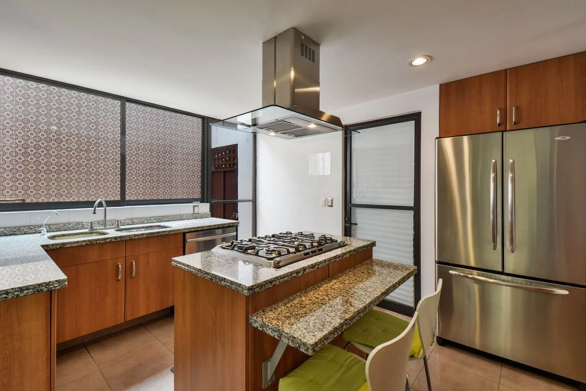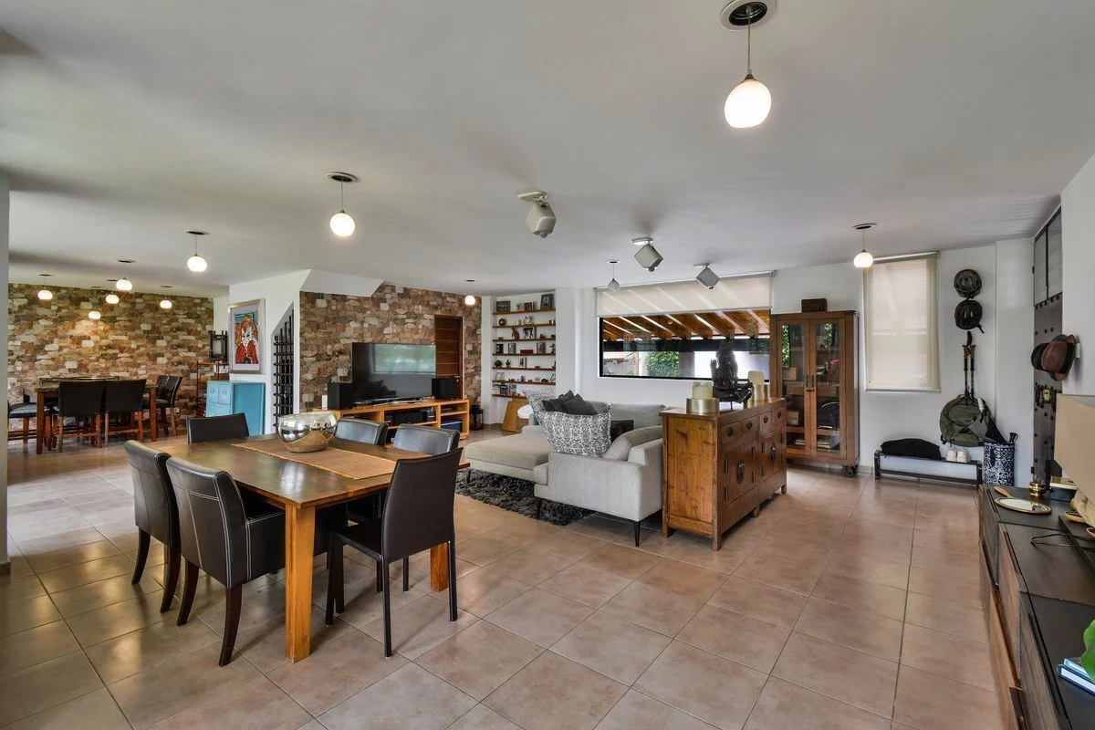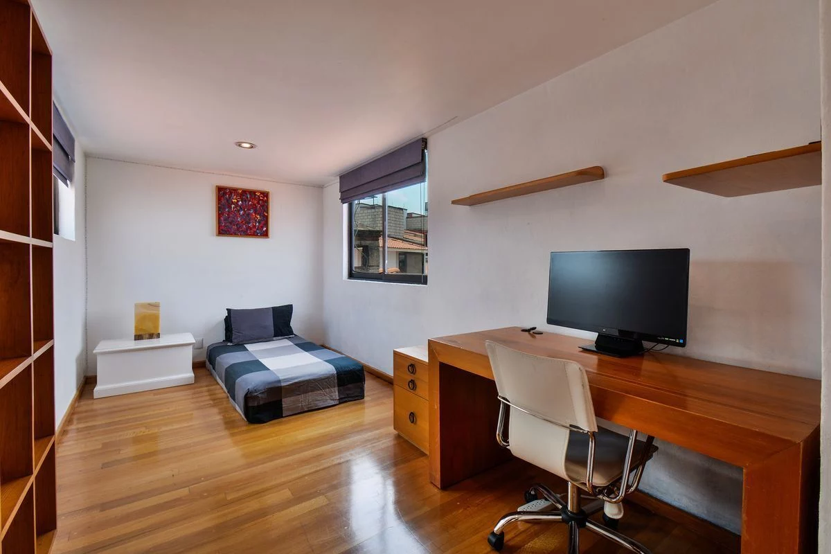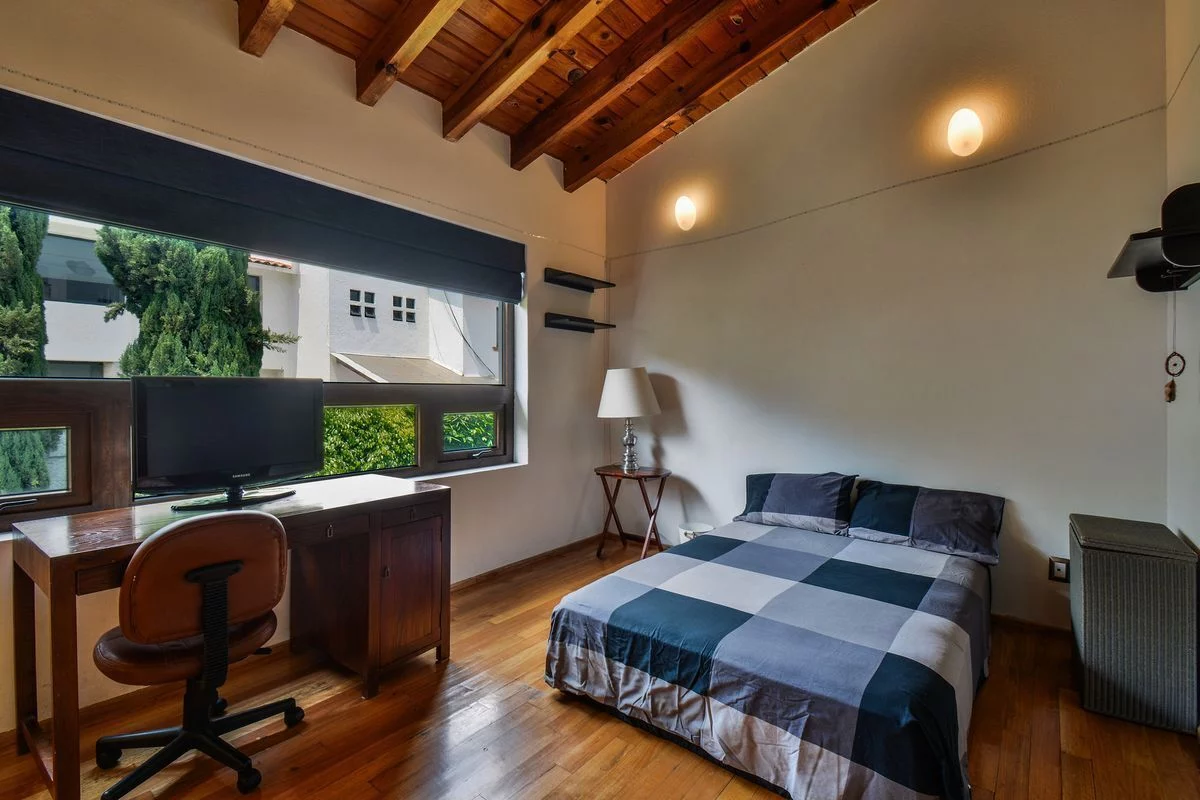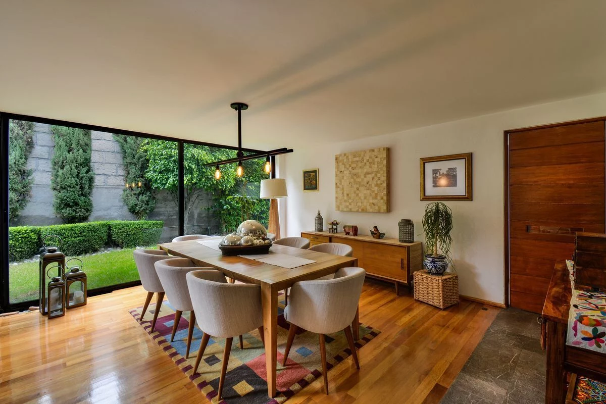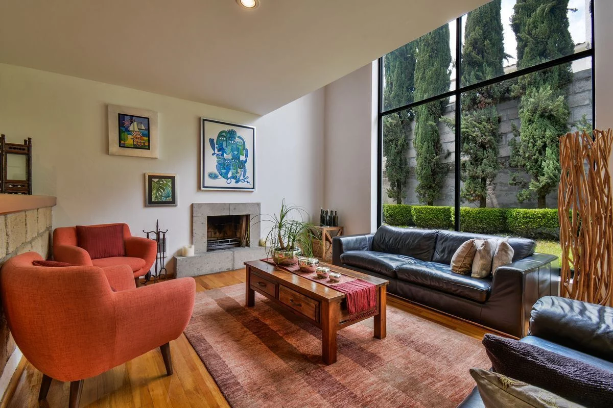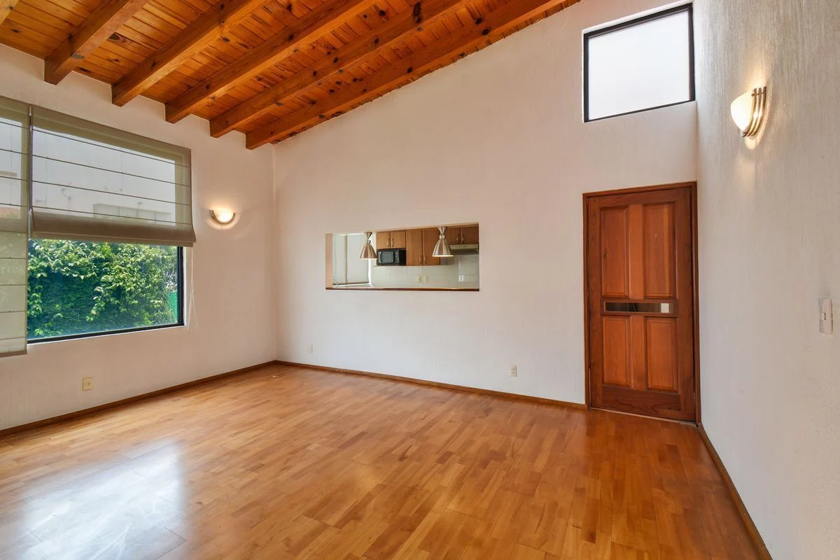 La casa te ofrece dobles alturas, techos altos, espacios muy luminosos y espaciosos. En planta baja cuenta con vestíbulo, sala con chimenea y bar con vista al jardín, comedor con salida al jardín, estudio, medio baño, cocina equipada, antecomedor, gran family room que se integra a una terraza techada y al jardín. En planta alta, recámara principal con vestidor y baño, 2a recámara con vestidor y baño, 3a recámara con closet y baño y estudio independiente o 4a recámara sin baño. Tiene 5 estacionamientos techados para autos grandes.