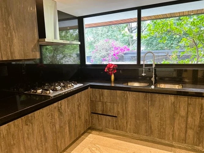 • Cocina abierta equipada con cubierta en granito + opción de cerrarse con cristal corredizo