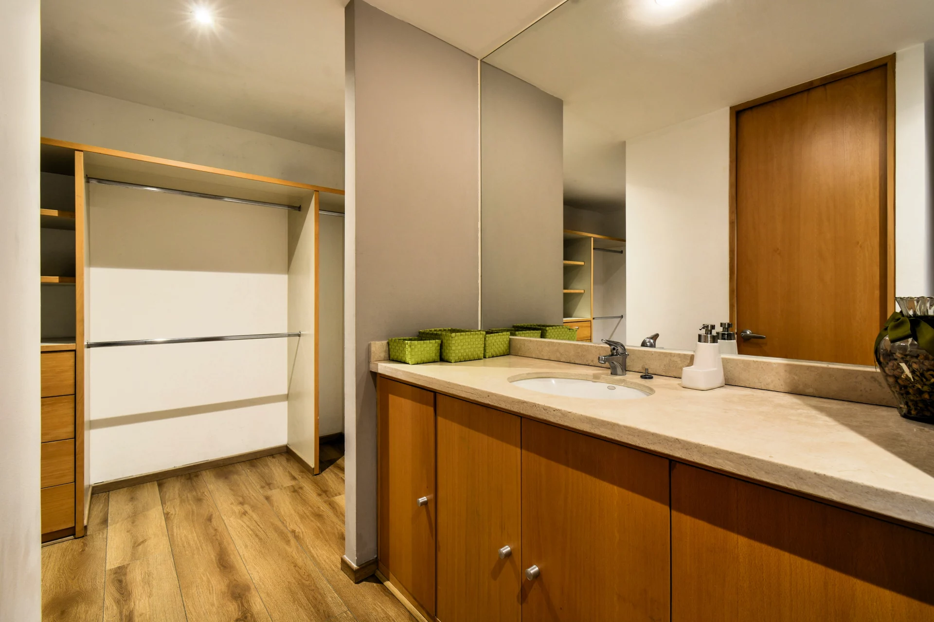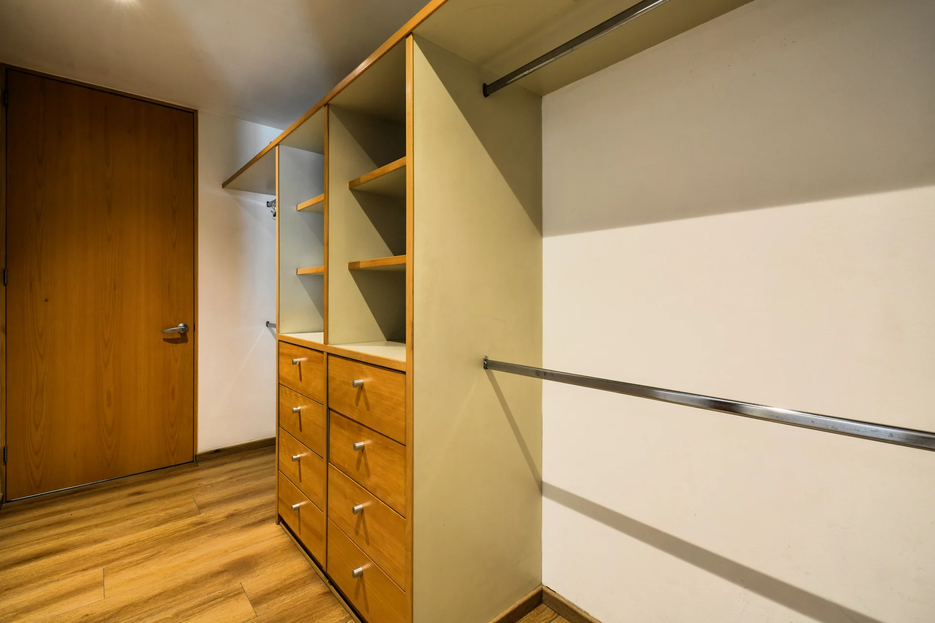 Tipo Loft con 1 recámara amplia y muy iluminada, con vestidor de gran tamaño, ofreciendo excelente espacio de almacenamiento. El baño completo, de generosas dimensiones, da servicio tanto a la recámara como al área social, aportando funcionalidad y comodidad para visitas.