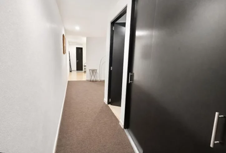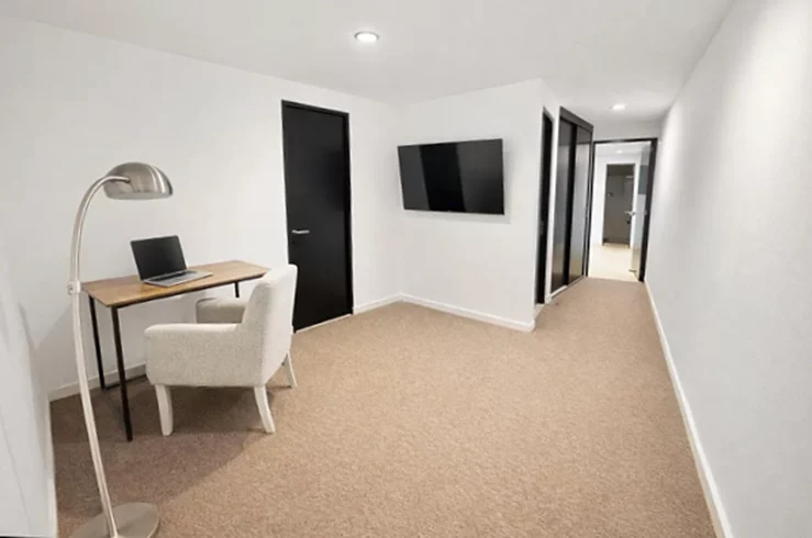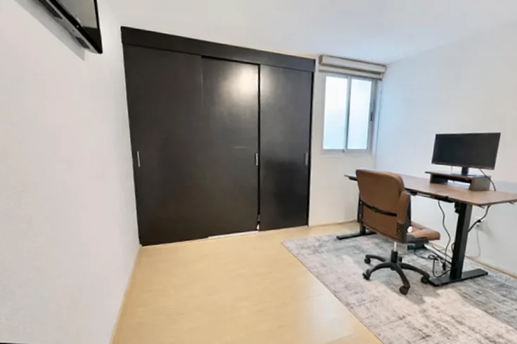 Recámara principal con vestidor y baño privado, recámara secundaria con clóset, el baño se comparte con estudio o sala de TV, pequeña área para coffe station.