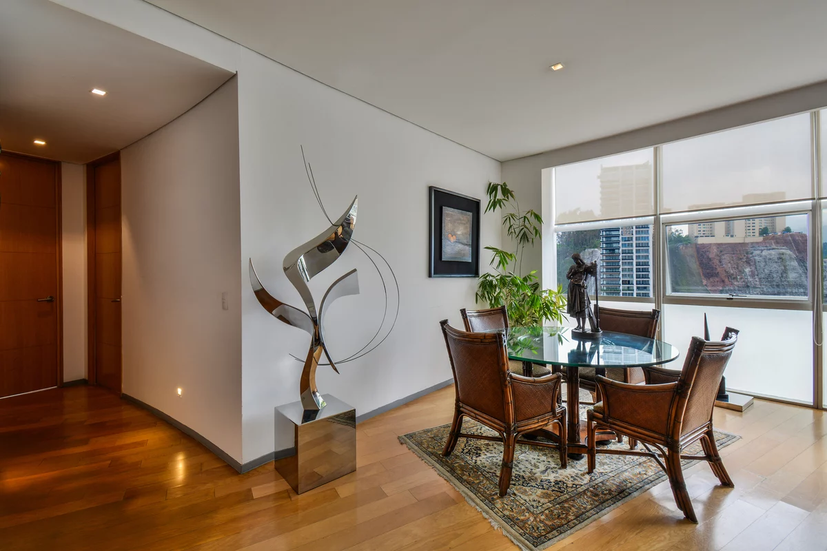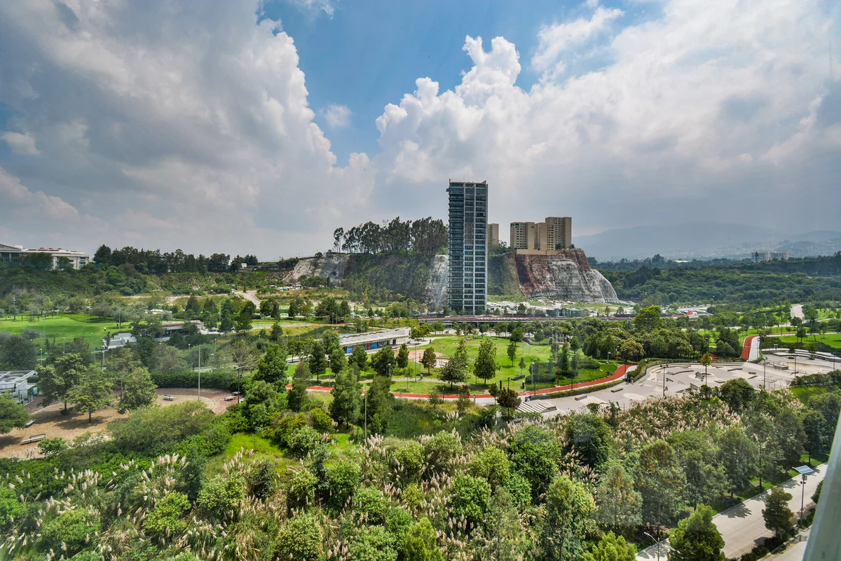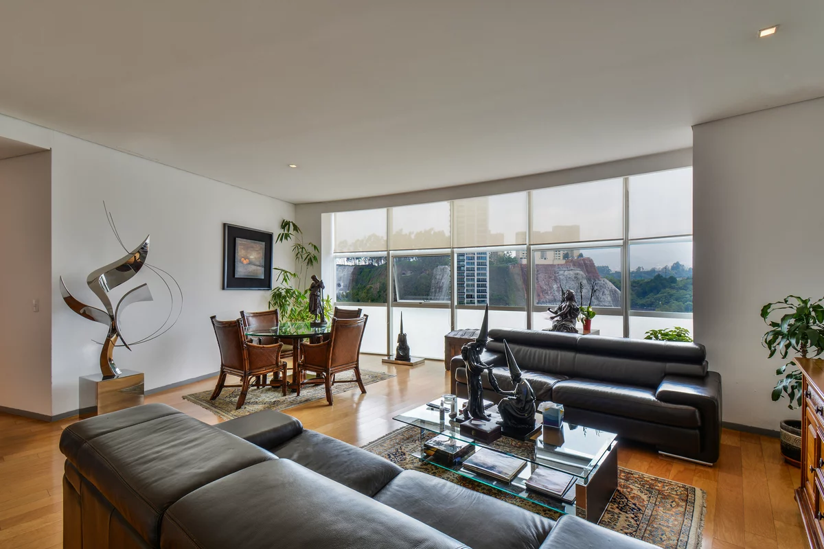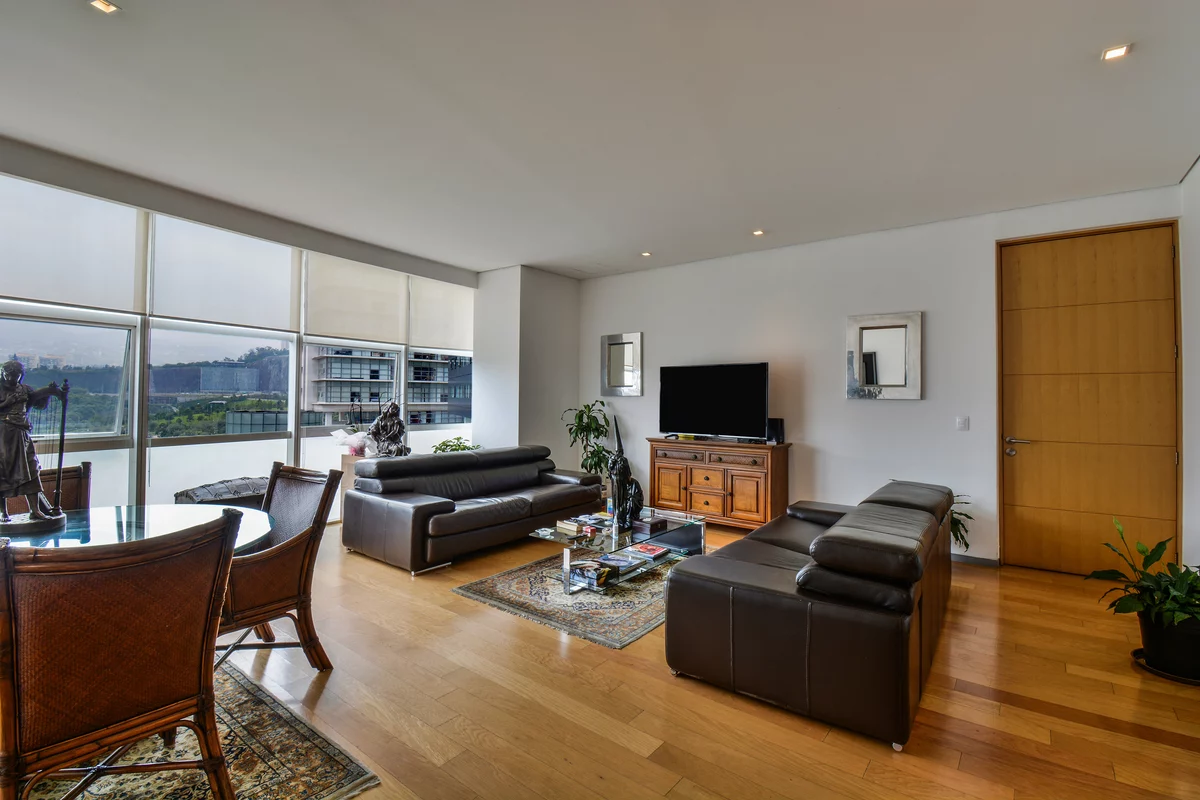 ¡APROVECHA! VENTA DEPARTAMENTO EN RESIDENCIAL SANTA FE, MUY CERCA DEL PARQUE LA MEXICANA. Departamento en piso 11 de la torre B, con espacios grandes, excelente ventilación y luz natural. Cuenta con gran sala comedor con ventanales de piso a techo con muy bonita vista, recámara principal con baño y vestidor, 2a recámara con closet que comparte baño con área social, cocina equipada, área de lavado, cuarto de servicio, 2 bodegas y 2 estacionamientos.