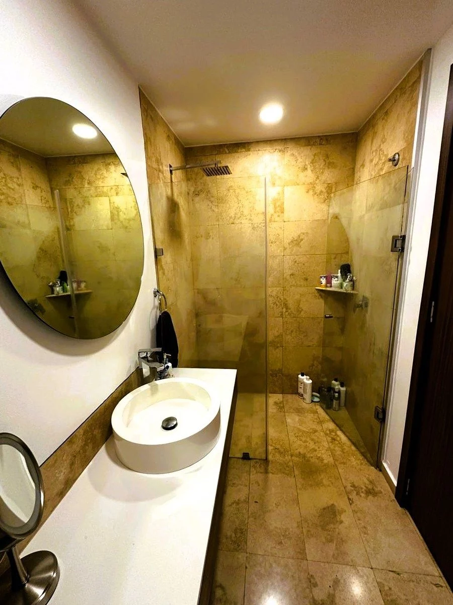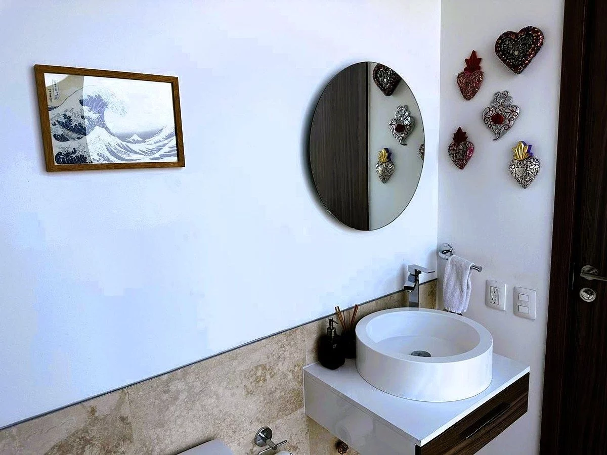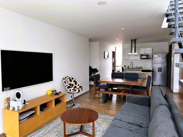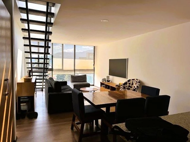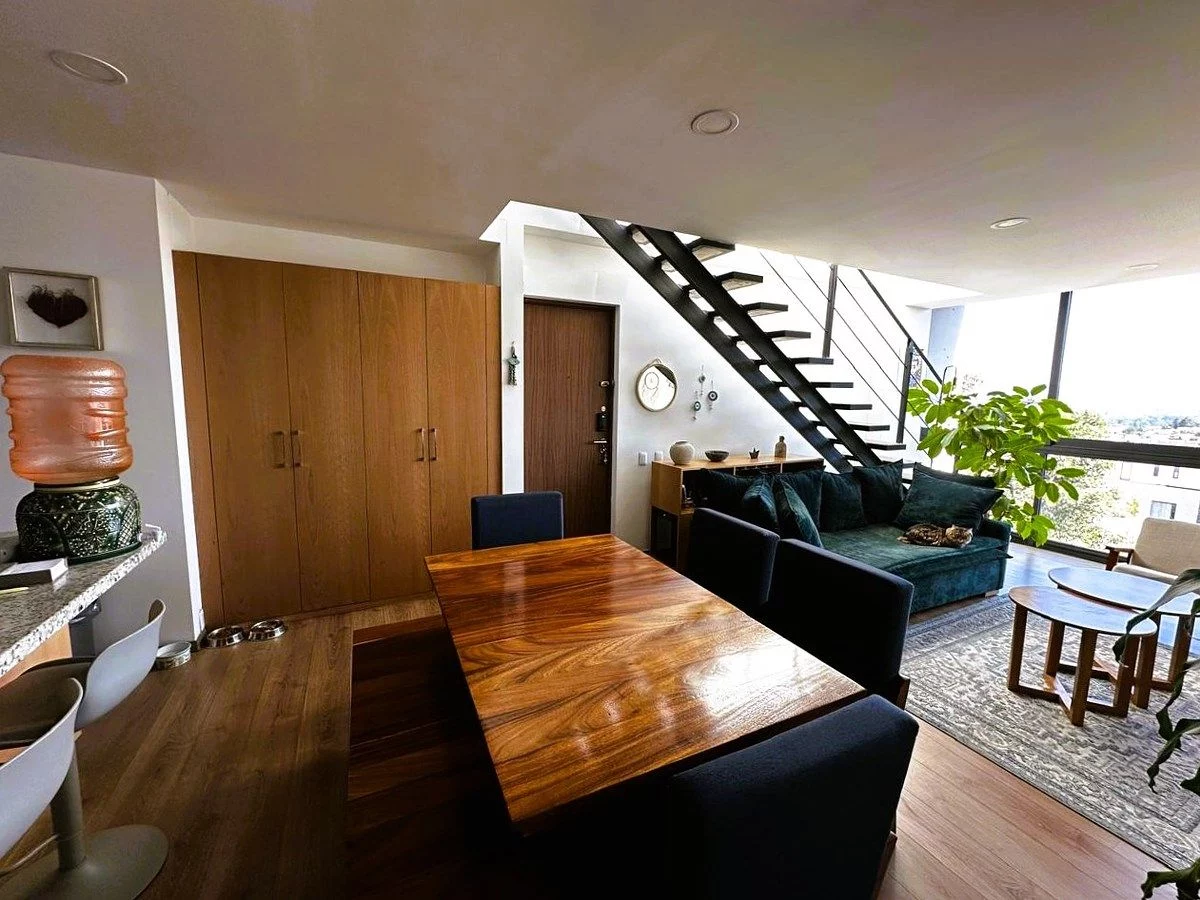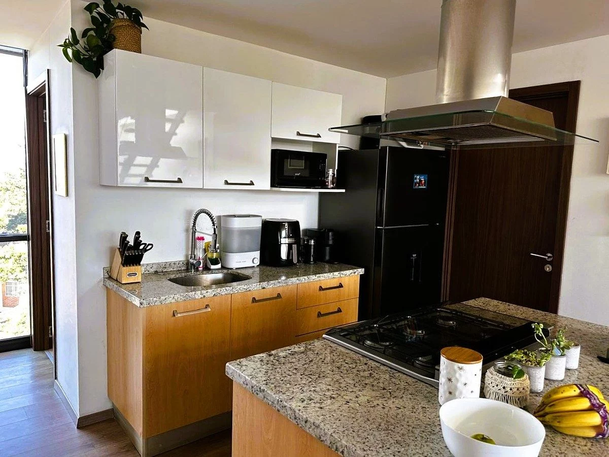 El departamento cuenta con dos recámaras; la principal con vestidor y baño privado, además de un baño completo que da servicio a la segunda recámara y al área social. La sala y el comedor se integran de manera armoniosa con una cocina funcional, creando un espacio cómodo y elegante para el día a día.